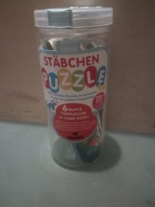 Este botecito no ocupa mucho espacio, es cómodo de llevar, y dentro contiene 18 palitos; es decir 6 puzzles diferentes. Cada palito está impreso por ambas caras, perteneciendo cada uno de ellos a un puzzle diferente. SIn embargo, si una de las caras pertenece al puzzle A, y la otra al puzzle B, todos los palitos del puzzle A, tendrán en su otra cara un fragmento del puzzle B, es decir, que si vamos a realizar una salida, una comida fuera de casa, una sala de espera de algún sitio…podríamos llevar tan solo seis palitos y tendríamos en realidad dos puzzles para montar. Excepto dos puzzles cuyos colores prinncipales son el azul claro, en el resto de puzzles prima un color diferente, con lo cual son fáciles de diferenciar los unos de los otros. Mi consejo es que con los niños más pequeños, separéis las piezas de cada puzzle, es decir, no le presenteis los 18 palitos pretendiendo que arme los puzzles, sino que los presentéis poco a poco, según vaya el niño adquiriendo destreza en ello. Está recomendado a partir de 24 meses.